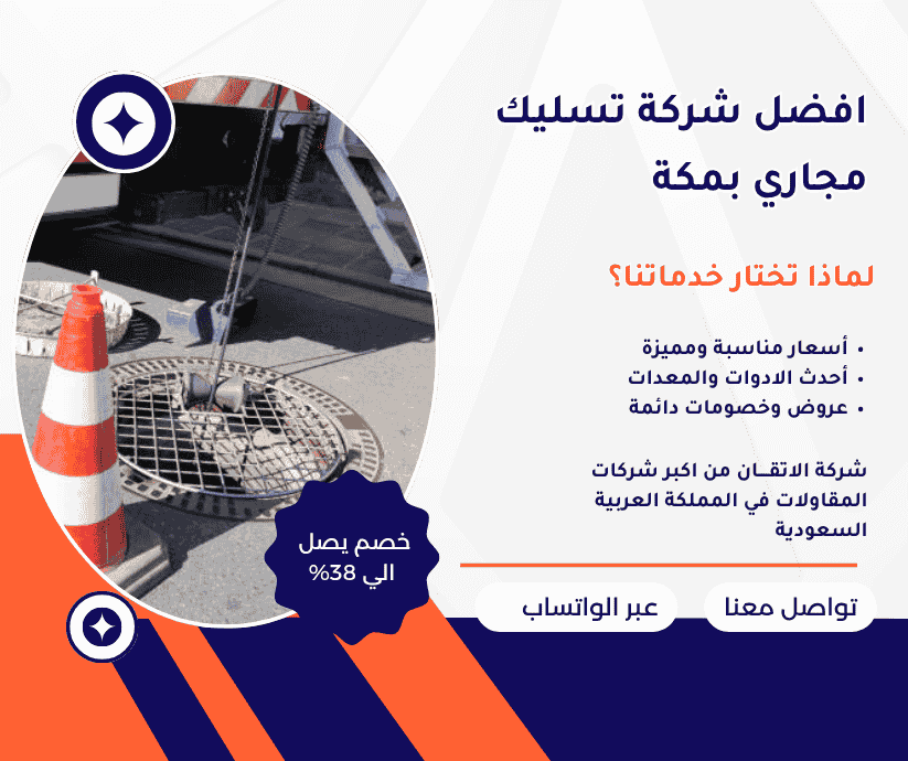 هل تعاني من انسداد مفاجئ في المجاري داخل منزلك أو مكان عملك بمكة؟ شركة تسليك مجاري بمكة تقدم لك الحل الفوري والنهائي لأي انسداد داخل منزلك أو مكان عملك، باستخدام أحدث المعدات والتقنيات المتطورة التي تضمن راحتك وراحة من حولك. سواء كانت المشكلة في المطبخ، الحمام، أو في أنظمة الصرف بالكامل، فريقنا جاهز على مدار الساعة لتقديم خدمة احترافية بمعايير عالية من الجودة والدقة. لا تسمح للمشكلة بأن تتفاقم أو تعطل يومك، تواصل معنا الآن لتحصل على بيئة نظيفة وآمنة بدون أي عناء وبنتائج تدوم طويلا