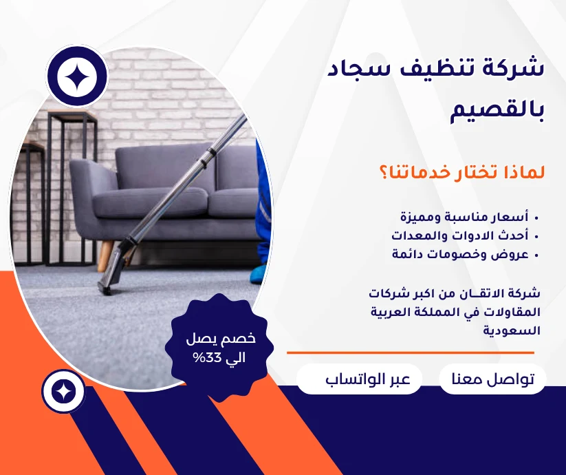 هل تبحث عن شركة تنظيف سجاد بالقصيم موثوقة واحترافية؟ إذا كنت تبحث عن شركة تنظيف سجاد بالقصيم تقدم لك نتائج مضمونة وكفاءة عالية، فأنت في المكان الصحيح. نحن نقدم خدمة تنظيف شاملة لجميع أنواع السجاد، سواء كان سجادًا منزليًا أو تجاريًا أو فندقيًا، مع التركيز على تنظيف عميق يعيد للسجاد رونقه الأصلي ويحافظ على ألوانه وجودته. نعتمد على أحدث الأجهزة والتقنيات المتطورة في التنظيف بالبخار والشفط العميق، مع استخدام مواد آمنة 100% تحمي أفراد الأسرة والحيوانات الأليفة من أي ضرر. سواء كنت تواجه بقعًا صعبة، روائح غير مرغوبة، أو أتربة متراكمة، فنحن نقدم لك الحل الأمثل بطريقة احترافية وسريعة، لتستمتع بسجاد نظيف، صحي، وذو مظهر جديد دون أي مجهود منك. تواصل معنا الآن لتجربة خدمة لا مثيل لها في مدينة القصيم.